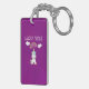 Un porte - clé acrylique avec une jolie illustration d'une licorne blanche assise sur sa croûte, souriant et joyeux. Des nuages souriants et un arc-en-ciel au-dessus. Texte : Happy Vibes. Image de levage adorable Placé sur un arrière - plan d'aquarelle rose violet.