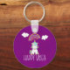 Keychain with a cute illustration of a white unicorn sitting on its rump smiling and looking happy. Smiling clouds and a rainbow overhead. Text says: Happy Vibes. Adorable uplifting image. Set on a pinkish purple watercolor background.