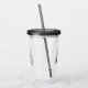 This acrylic drink tumbler with straw and lid has a happy white mother cat sitting with her three cute kittens who are all wearing pink bows around their necks and are black, white, and grey.