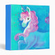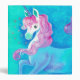 A beautiful white unicorn with violet pink mane, prancing against a bright yet soft looking aqua blue background, with ten silver stars around her face. Her horn is deep ultramarine blue. An origina acrylic painting by Artist Angela Flemming.