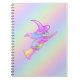 My drawing of a happy witch flying on a broomstick. She has a pink purple hat and dress, green and orange striped leggings, green skin, and long blue hair.