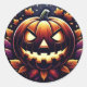 This sticker features a glowing, carved Halloween pumpkin with menacing eyes and a wide grin, surrounded by autumn leaves under a starry night sky, symbolizing spooky fall vibes.