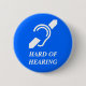 International Symbol for the Deaf with the words HARD OF HEARING below it. This button will encourage people to speak louder and more clearly.
