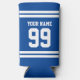 Hard seltzer can coolers with sports jersey number. Athletic stripe design with custom name. Blue or custom colour. Cool gifts and party accessories for sports fans, football players, coach etc. Double sided print. Personalize with your text.