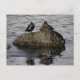 Two male harlequin ducks keep a female with her head tucked in company on a rock. Below them another male duck glides past in the water. Harlequin ducks live in the bays of Unalaska Island all year long. The females are a plain brown with a white spot on their heads. The males are the colourful ones, with complex designs on their bodies in red, grey, white and black coloured feathers. Harlequin ducks are a native species of the Aleutian Islands as well as coastal Alaska.
