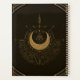 Harmonie des éléments : lune, or et géométrie. Là où se cachent les secrets de l'univers, une lune croissant se lève avec une surface qui reflète la lumière des étoiles dans une lueur dorée. La lune se trouve majestueusement dans un cadre circulaire qui agit comme un cercle protecteur, tandis que des lignes dorées coulent de son centre comme des rayons de soleil, perçant l'obscurité. L'arrière - plan noir profond augmente le contraste avec les éléments dorés et crée une atmosphère de mysticisme