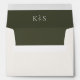 HARMONIE, enveloppe faire-part de mariage. Caractéristiques, monogramme de branche botanique sur doublure vert olive et modèle d'adresse de retour sur rabat arrière.
