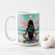 Beautiful ai art depicting a gorgeous woman meditating on the beach with pina and blue clouds, ocean waves, white sand and sea glass.