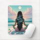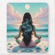 Beautiful ai art depicting a gorgeous woman meditating on the beach with pina and blue clouds, ocean waves, white sand and sea glass.
