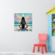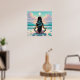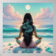 Beautiful ai art depicting a gorgeous woman meditating on the beach with pina and blue clouds, ocean waves, white sand and sea glass.