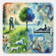 Discover "Harmonie de Vie", a captivating painting that skillfully blends natural elements and intimate moments. This work of art represents a loving couple standing in a green meadow, symbolizing love and connection. In the center, a majestic green tree stands, symbolizing life and tranquility. To the right, a person lying on a bed, immersed in a moment of reflection or dream, conveys a feeling of peace and contemplation. Down below, two white dogs play and rest, adding a touch of loyalty and simple joy to the scene. The geometric patterns and soft colors, with a predominant blue and green, evoke an atmosphere of calm and serenity. The entire work transports the viewer into a state of inner harmony and well-being, creating a space for relaxation and meditation. This painting is ideal to transform any space into a sanctuary of peace and natural beauty. It inspires a feeling of comfort, love and connection with nature, while bringing a modern artistic touch.