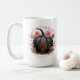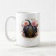 This custom monogrammed mug features a black and gold colored pumpkin with floral accents over a gold colored double hexagon frame. The monogram on the other side can be customized with any letter or name. The font and text colors may be customized as well, and the images may be adjusted for size or placement.