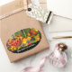 A colorful harvest time sticker with fruits and vegetables, flowers and leaves by a wooden fence, add the text of your choice.