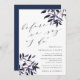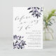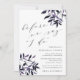 Rustic elegant rehearsal dinner invitation features rich off-black lettering in chic block and italics with calligraphy accents, with sprays of watercolor fall foliage at the corners in autumn harvest shades of plum purple and midnight blue. Rehearsal dinner invitations reverse to solid navy blue.