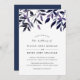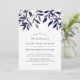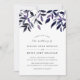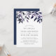 Rustic elegant wedding invitation invitation features rich off-black lettering in chic block and italics with calligraphy accents, topped by sprays of watercolor fall foliage in dark jewel tone shades of midnight blue and plum purple. Invitations reverse to solid navy blue.