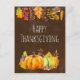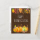 A happy thanksgiving postcard with a watercolor illustration of pumpkins, acorns, mushrooms and seasonal autumn leaves.