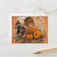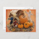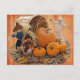 The harvest postcard features a basket of hay with pumpkins and leaves with two cute scarecrows and a ghost. Perfect greeting for the upcoming fall season.