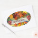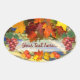 A colorful autumn sticker with grapes, apples and fall leaves.