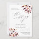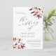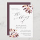 Rustic elegant wedding invitation invitation features dark plum brown lettering in chic block and italics with calligraphy accents, with sprays of watercolor fall foliage at the corners in rich autumn harvest shades of purple and golden plum.