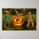 Two kids harvesting a great pumpkin for the Halloween Jack-o-Lantern. A black cat & owl representing witchcraft on Hallows Eve. This work 1900-1916 is in the public domain in the United States because it was published (or registered with the U.S. Copyright Office) before January 1, 1927.
