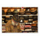 sales booth at christkindlmarkt filled with hats, mostly traditional austrian style - he blends in perfectly with his brown vest and the smoking pipe