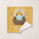 Un linge de toilette personnalisé et adorable, accompagné d'une éclosion de poussin jaune sucré à partir d'une coquille d'oeuf bleue dans un nid douillet, est entouré de fines fleurs de printemps roses.