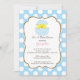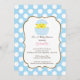 A Sweet Easter Chick Boy Baby Shower Invitation featuring a cute baby chick set on a blue and white polka dots background. Perfect for a Easter Time baby boy baby shower. Matching products also available in our shop at www.celebrateitinvites.com. ©Zenware