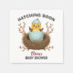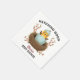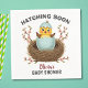 Adorable baby shower napkins featuring a sweet yellow chick hatching from a blue eggshell in a cozy nest, surrounded by delicate pink spring blossoms.