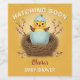 Adorable baby shower wine label featuring a sweet yellow chick hatching from a blue eggshell in a cozy nest, surrounded by delicate pink spring blossoms.