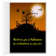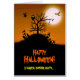 Une scène de cour hantée effrayante avec une chouette perchée dans un arbre éffrayant qui a également le nez d'un hangman qui y est suspendu. L'arrière - plan est un ciel orange et il y a une pleine lune avec des chauves-souris qui volent à travers. Design très amusant et effrayant pour votre carte de voeux Halloween.