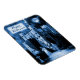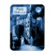 This spooky Halloween Haunted House flexible magnet is done in shades of ghostly blue and white. The customizable text says, "Happy Halloween." The scene shows a castle under the light of the full moon, with a lightning bolt striking it. On the front walkway, two ghosts hover. The woman is mourning by a grave. The design is made to look worn and textured. This personalized magnet has a cold, Gothic, antique romantic feel.