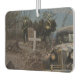 A rusty old car sits in the foreground of a graveyard scene with tombstones and eerie figures. The backdrop features a desolate landscape and an ominous, shadowy figure dressed in black beside a gravestone marked "John Martin."