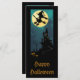 Spooky halloween bookmarks featuring a haunted house with a witch flying on a broomstick in front of a full moon. Thee are glowing skulls laing on the ground near the path leading to the haunted house. Text can be changed to suit your own needs and style. sgb01