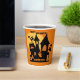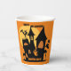Haunted House Halloween party paper cup! Orange and black with a haunted house, ghost in haunted house and flying around, and a flying witch on broomstick!