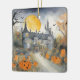 The image shows a watercolor painting of a spooky mansion with pumpkins on the front driveway. The mansion has a tall, pointed roof. The trees in the background are bare, and the sky is cloudy and dark. The overall mood of the image is spooky and eerie.
