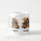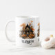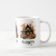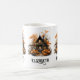 A mug with a cool and spooky illustration of a wooden haunted house. Surrounded by big orange pumpkins and trees with orange leaves. Windows with orange lights add a nice glow. Fun Halloween design.