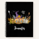 Spiral notebook with a cute image of a haunted pumpkin house with a big witches hat on top and ghosts and bats flying around.