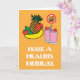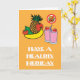 Send a cheerful Birthday message to that friend or family member who likes to live a healthy life. Featuring an apple, pear, pineapple, strawberry, banana and two glasses of healthy smoothies with a strawberry on top plus a beef burger in a banned sign. The message "Have A Healthy Birthday" is below them in white and it's all set against a bright and contrasting orange background. Put your own special Birthday message inside.