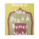 This artwork features the phrases "Have a Nice Day" and "& A Better Night" arranged vertically within a decorative, arched frame. Set against a solid yellow background, the text is rendered in a stylized, slightly ornate font that adds a whimsical touch to the overall design.