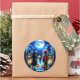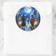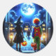 Scary Halloween stickers with ai art depicting a little boy and girl in a clown and witch costume walking out the house to encountered a scary monster at the end of their sidewalk.