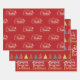 Have Yourself a Merry little Christmas in a decorative cursive script font in white and golden yellow. Embellished with a star, snowflakes, holly and a sprig of evergreen needles. Set on a very saturated warm red. A sheet of stylized Christmas trees in yellow, red, brown and yellow and a sheet with Merry Christmas in mixed golden yellow and white cursive font.