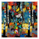 A whimsical cat with a geometric, stained-glass appearance stands in a vibrant forest of birch trees. The background features a colourful blend of autumn leaves and hues of blue and yellow. Digital Art Photoshop