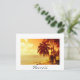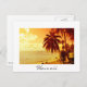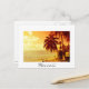 Postcard with an orange sunset on a beach with palm trees on the tropical island of Hawaii, USA with a white border and the text: 'Hawaii'.