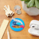 Hawaiian surfing art of a retro striped surfboard with hibiscus flowers and honu turtles, in front of a big wave with some red hibiscus flowers and outline of some palm trees in front of the wave.