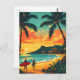 A festive postcard featuring a tropical Hawaii Christmas with surfers in Santa hats, palm trees, and a golden sunset beach scene. A fun and unique holiday greeting card.