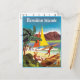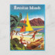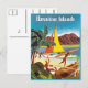 A vibrant vintage-style postcard of the Hawaiian Islands featuring bold tropical colours, palm trees, traditional outrigger canoes, surfers, and golden sailboats against a dramatic volcanic mountain backdrop. It captures the spirit of Hawaiian adventure, surf culture, and timeless island beauty.
