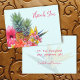 Tropical flowers and pineapple thank you notes. Flat, pale blue cards with Hawaiian flowers on the front. Hibiscus, plumeria / frangipani and bird-of-paradise flowers are all part of the design with two pineapples in the center of the flowers. Bright pink text templates on front and back are easy to customize as needed. Include a message and signature on the back over a bird-of-paradise floral background.