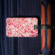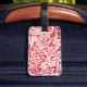 Custom luggage tag shown with a cute red coloured hawaiian print with text. Customize this tag or buy as is.