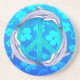 3 Bottlenose dolphin swimming around an ocean blue peace sign with a Hawaiian pattern background of Honu turtles and hibiscus flowers.