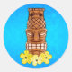 Hawaiian Tiki Mask with yellow hibiscus flowers at it's base, the state flower of Hawaii with a ocean blue background.